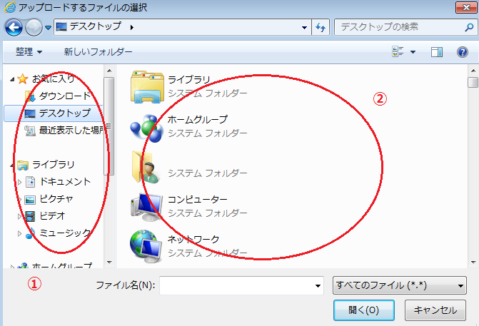 例えば、デスクトップにエクセルファイルがある場合は、デスクトップをクリックしてください。デスクトップ以外(マイドキュメントなど)にある場合は、ファイルがある場所クリックします。