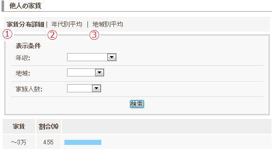 他人の家賃ページでは、年収ごとの家賃割合、地域別の家賃割合、世帯人数別の家賃割合、年代別の平均家賃などを見ることができます。