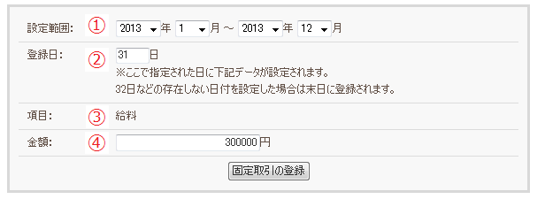 画面のように登録すると、2013年1月~12月の各月末日に給料300,000円の取引が、家計簿に登録されます。